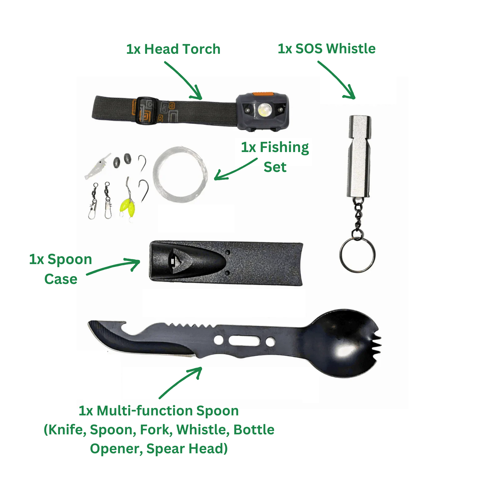 The Bushman Survival Kit contains 15 essential tools including a fire starter, head torch, multi-tool, compass, whistle, and much more.